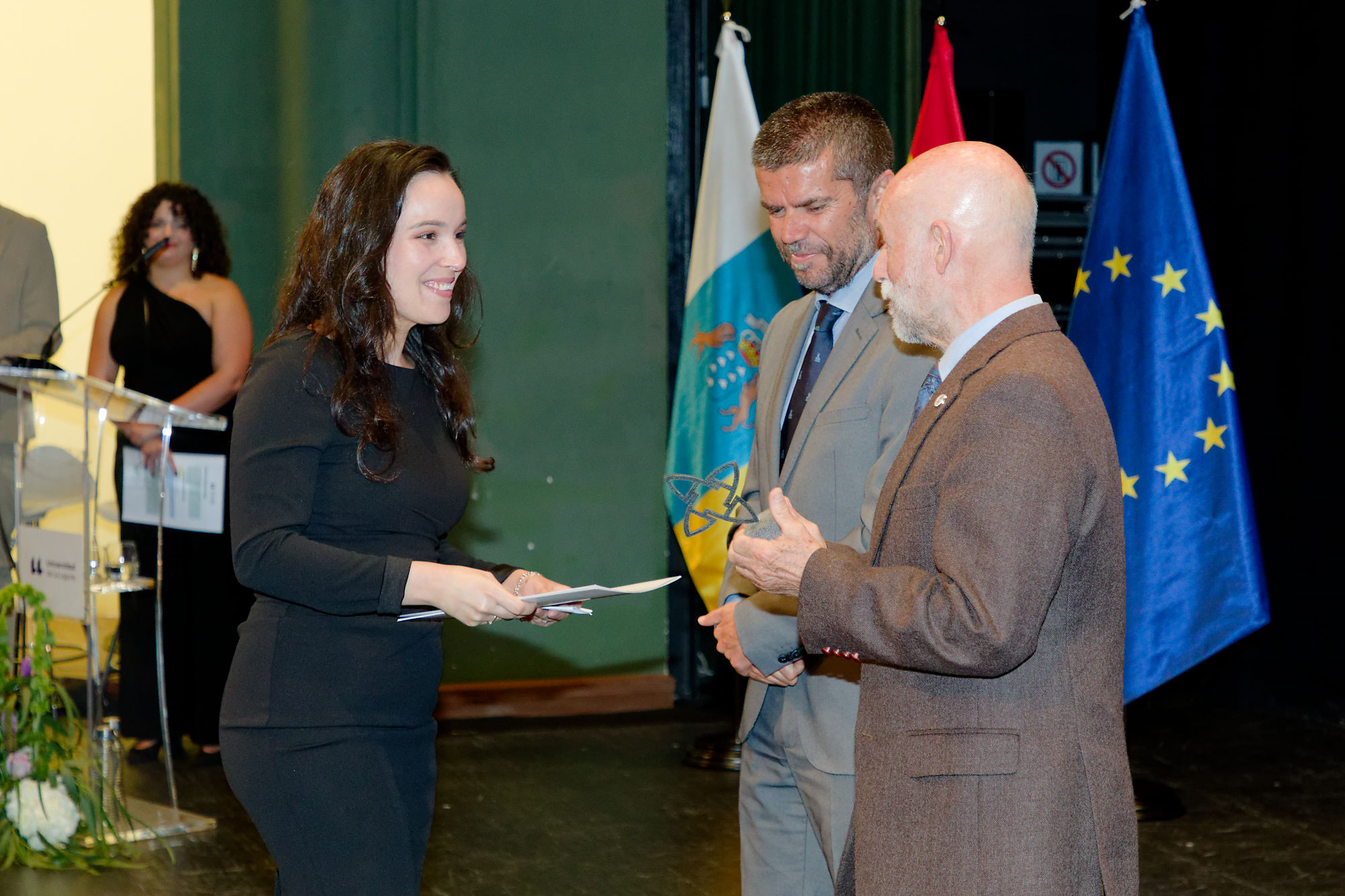 Tras la entrega de los premios Alumni ULL, la soprano Candelaria González Torres, acompañada por el guitarrista Emilio Negrín, ofreció un interludio musical antes de dar paso a la entrega de los Premios Institucionales de la ULL, que reconocen la labor en diferentes ámbitos del conocimiento y la gestión universitaria.