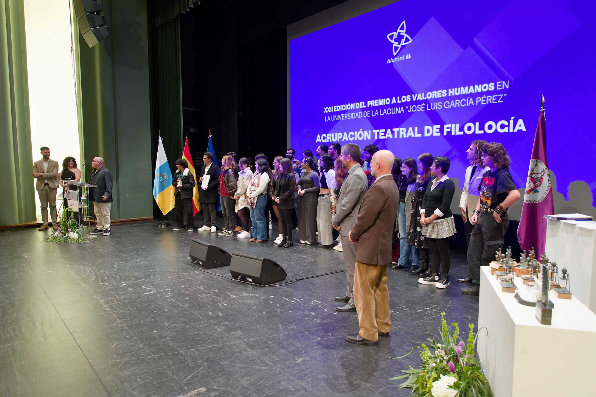 El XXII Premio a los Valores Humanos en la Universidad de La Laguna José Luis García Pérez Alumni ULL- Consejo Social de la ULL, en colaboración con Cajasiete, fue concedido a la Agrupación Teatral de Filología. Este reconocimiento destaca su trayectoria de más de cuatro décadas como uno de los colectivos culturales más activos y longevos de la universidad, con un firme compromiso social que trasciende el ámbito académico. El profesor de Filología Española y director del grupo, José Antonio Ramos Arteaga, reconoció el galardón. La dotación de 1.500 euros será donada a dos ONG centradas en los colectivos de migrantes y de trans.